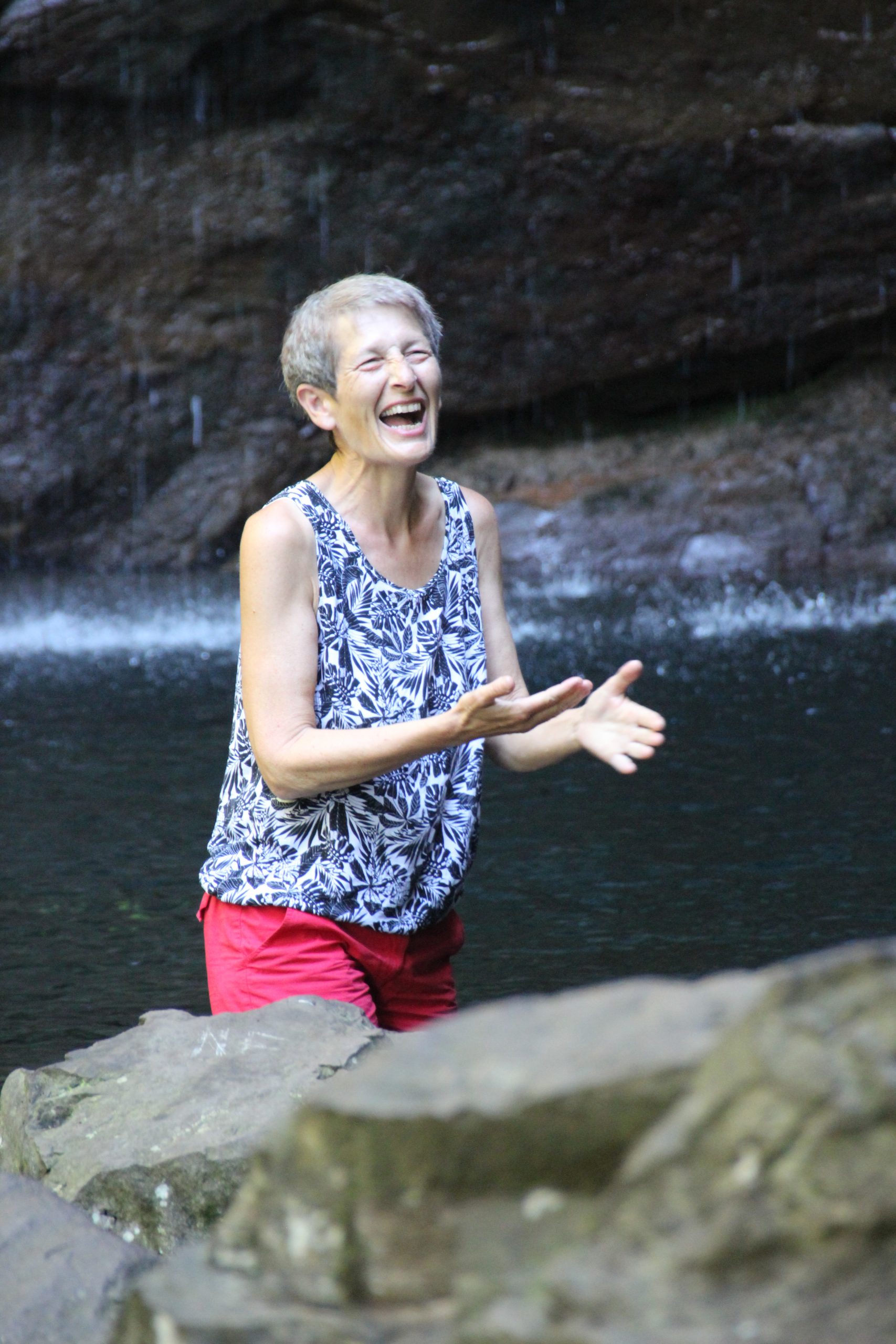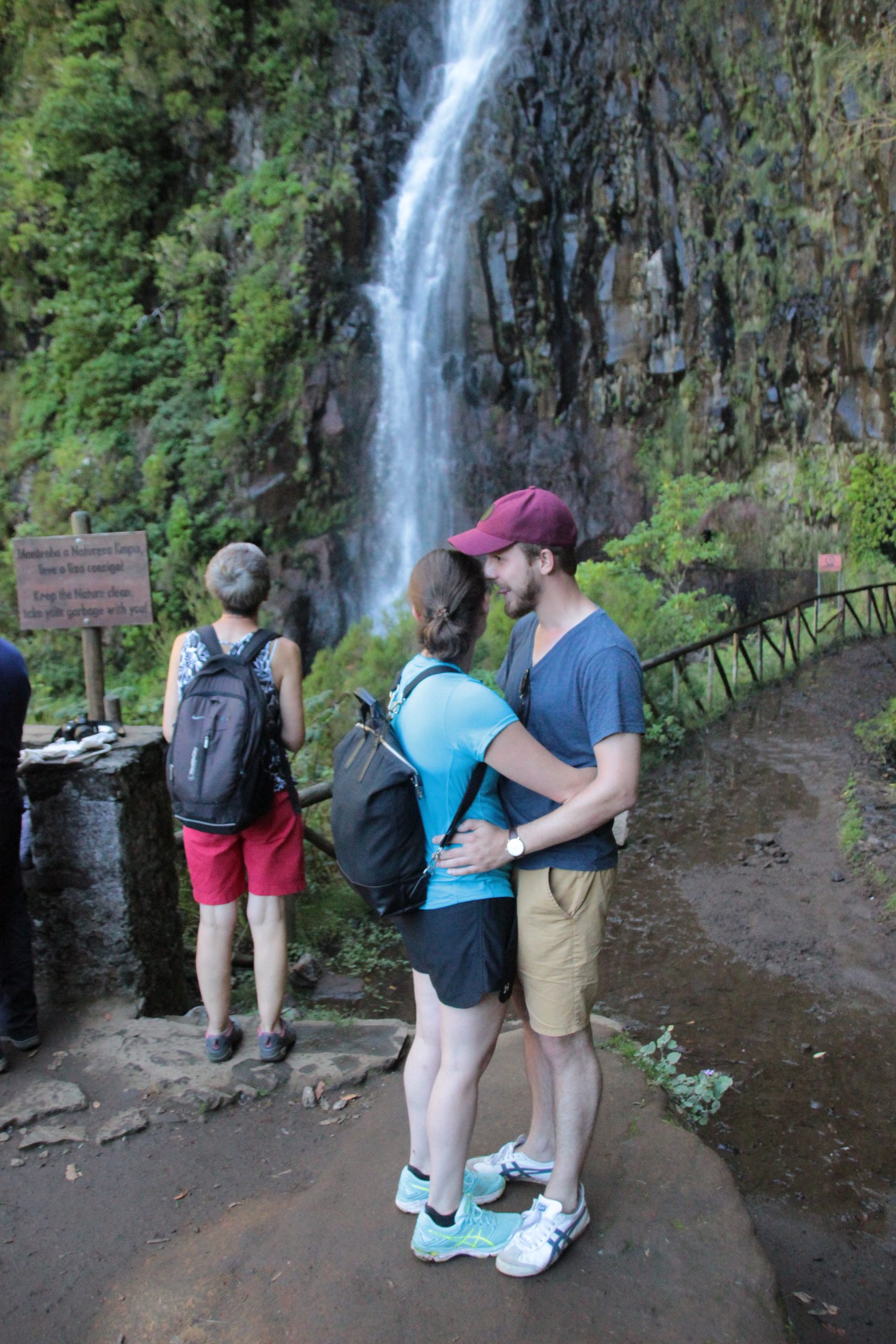 Weiter geht die Wanderung zu den 25 Quellen (Levada das 25 Fontes). Links der abschüssige bewaldete Hang, rechts die Levada, daneben auch dichter Wald vor den steil aufsteigenden Felsen und dazwischen ein schmaler Weg. Beim Entgegenkommen muß auch schon mal eine/r auf den Rand der Levada steigen. In einem Felsenrund endet der Weg, mehrere kleine Wasserfälle füllen das davorliegende offene Becken. Eiskaltes Wasser, aber Ruth und ich mußten einfach zwei Schwimmzüge wagen. Brrrrr, war das schön.
